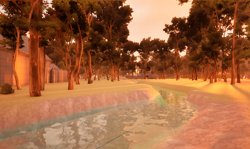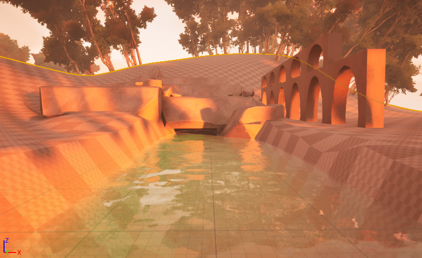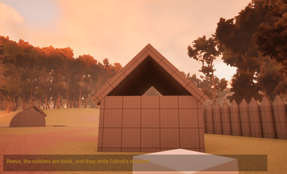 First are shots from a village with toll road, ruins, and bandit camp. Any random cubes or spheres are the current placeholders for the dialogue and systems. The terrain is subject to tweaking especially as experiments with water and fog continue. Art is subject to change due to the nature of placeholder objects in development. Current photos include: A line of dialogue, scene from the edge of the village creek up towards the bandit camp, some of the initial mystery locations for lore, a previous in-progress top-down shot in engine of the whole map, and one of the initial configurations for where the spring that feeds the creek exists with ruins.